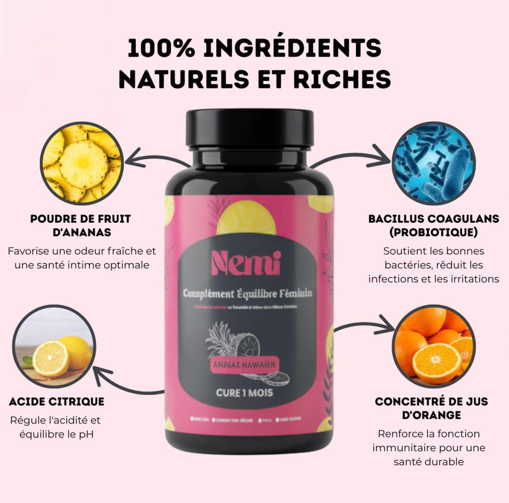 Ananas works from within to neutralize unwanted odors and regulate yeast levels, giving you instant freshness and confidence. Simply take one pineapple-flavored capsule daily to enjoy a subtle boost that lasts all day.